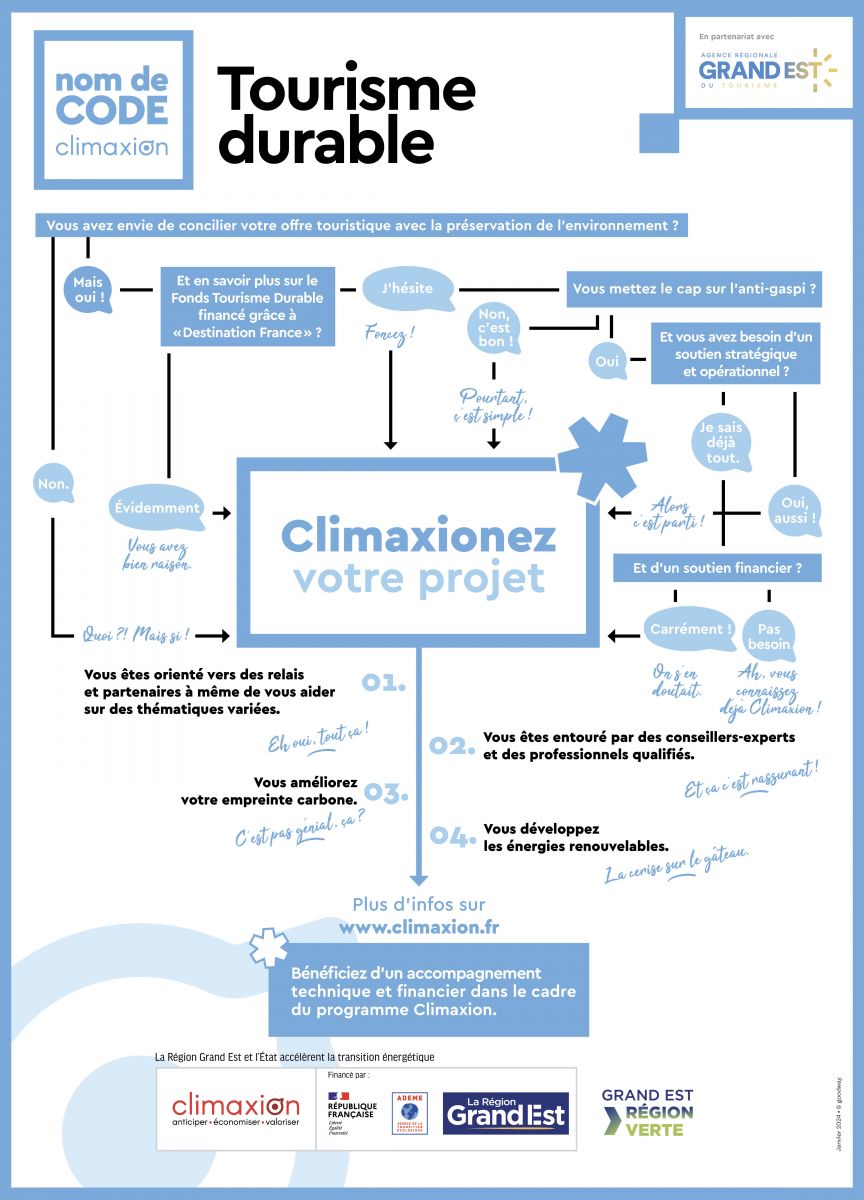 La Région Grand Est et l'ADEME, à travers le programme Climaxion, soutiennent la transition du secteur touristique. Les acteurs du tourisme peuvent bénéficier d'un accompagnement sur-mesure et d'aides spécifiques pour s'engager dans la transition écologique et proposer des expériences plus responsables à leurs clients touristes.