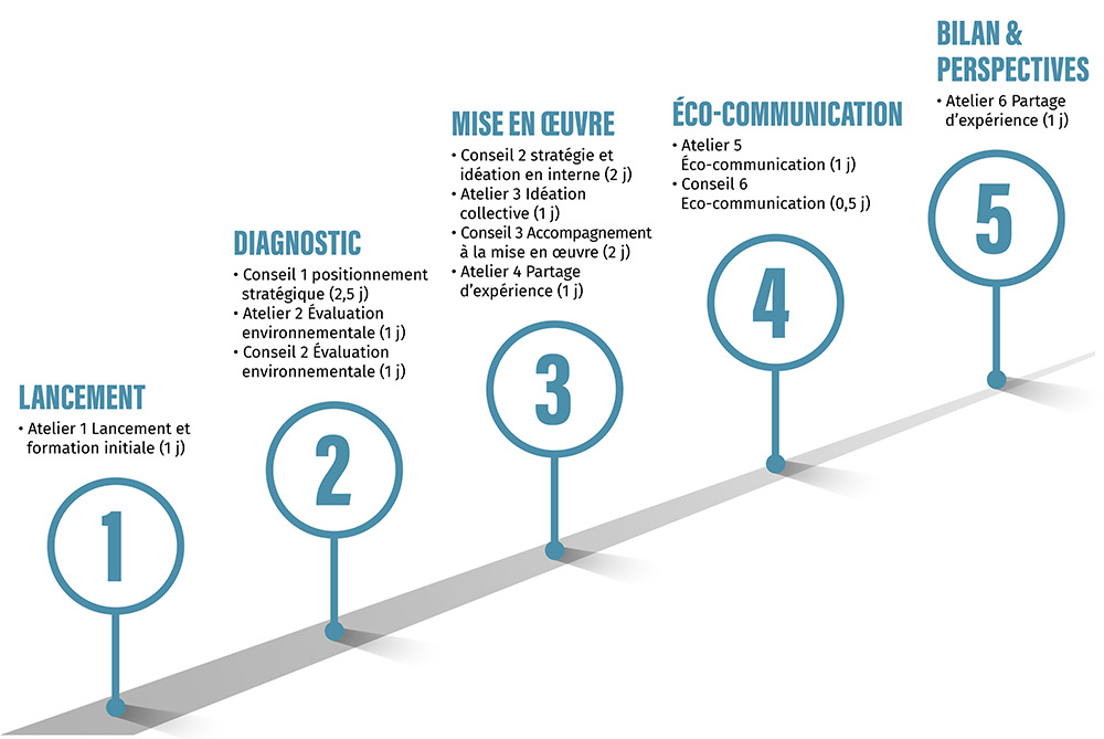 Le parcours d’accompagnement mixe ateliers collectifs et conseils individuels. Il est structuré en 5 étapes, pour un total de 6 ateliers collectifs inter-entreprises et 8 jours de conseils individuels par entreprise.