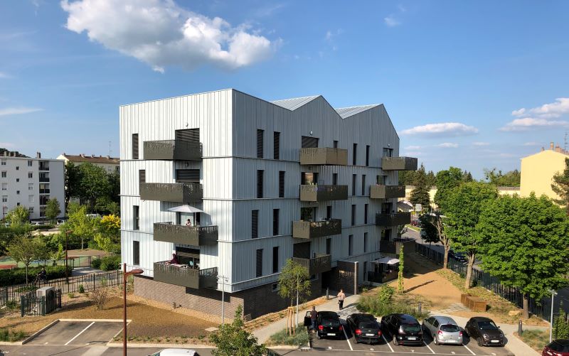 - Points remarquables : Bâtiment certifié Passiv’haus HQE, lauréat de l’appel à projets Climaxion, méthodologie négaWatt. Bonne intégration (réinterprétation des typologies du quartier). Aménagement lié aux véhicules minimisé : mutualisation d’un parking voisin. Maintien de la végétation du site. Chantier en grande partie en filière sèche (préfabrication). Pompe à chaleur haute température double service (ECS/Chauffage) air/eau.