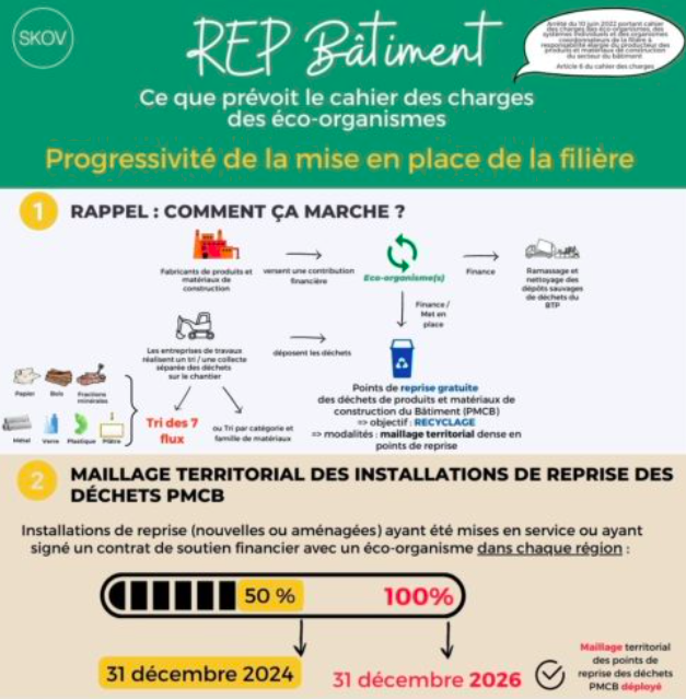 Sur le sujet de la REP Bâtiment, l’équipe de SKOV a formalisé des infographies claires et complètes permettant d’appréhender ce que prévoit le cahier des charges des éco-organismes. Elles sont toutes libres d’accès et de téléchargement sur leur site internet. Vous retrouverez notamment :