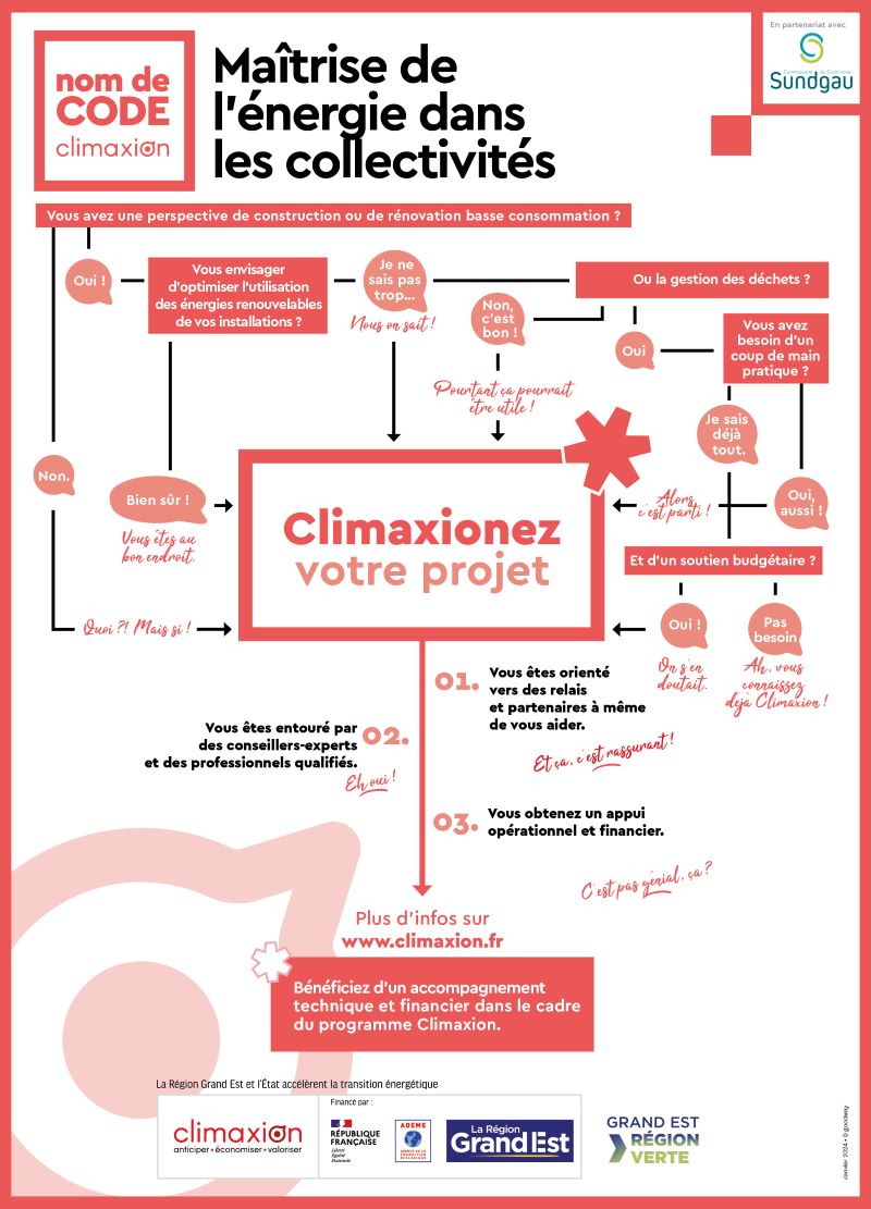 La Région Grand Est et l'ADEME, à travers le programme Climaxion, soutiennent les initiatives des collectivités territoriales dans leur souhait de maîtriser leurs consommations énergétiques. Les territoires souhaitant s'inscrire dans une démarche de transition énergétique peuvent bénéficier d'un accompagnement expert et d'aides spécifiques pour réaliser les études préalables et développer leur projet.
