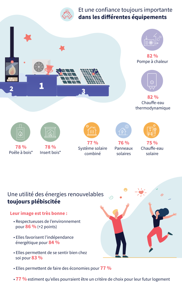 96% des Français estiment qu’il faut encourager les filières EnR et pour autant d’entre eux, la confiance dans les technologies de production d’EnR est très bonne. La proportion de ménages disposant d’un équipement de ce type au domicile augmente (44%, + 3 points par rapport à 2019), mais cette part n’est pas (encore) majoritaire. Un tiers des personnes interrogées envisagent toutefois d’acheter des équipements utilisant les EnR prochainement (+ 7 points par rapport à 2019).