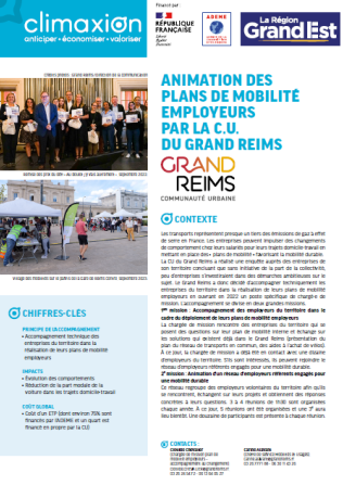 Les transports représentent presque un tiers des émissions de gaz à effet de serre en France. Les entreprises peuvent impulser des changements de comportement chez leurs salariés pour leurs trajets domicile-travail en mettant en place des « plans de mobilité » favorisant la mobilité durable. La CU du Grand Reims a réalisé une enquête auprès des entreprises de son territoire concluant que sans initiative de la part de la collectivité, peu d’entreprises s’investiraient dans des démarches ambitieuses sur le sujet. Le Grand Reims a donc décidé d’accompagner techniquement les entreprises du territoire dans la réalisation de leurs plans de mobilité employeurs en ouvrant en 2022 un poste spécifique de chargé·e de mission. L’accompagnement se divise en deux grandes missions.