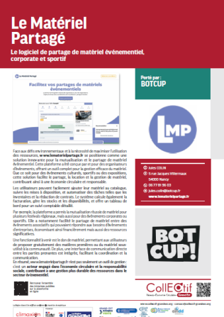 Face aux défi s environnementaux et à la nécessité de maximiser l’utilisation des ressources, www.lematerielpartage.fr se positionne comme une solution innovante pour la mutualisation et le partage de matériel événementiel. Cette plateforme a été conçue par et pour des organisateurs d’événements, off rant un outil complet pour la gestion e ffi cace du matériel. Que ce soit pour des événements culturels, sportifs ou des expositions, cette solution facilite le partage, la location et la gestion de matériel, contribuant ainsi à une économie circulaire et responsable.