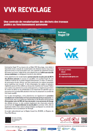 L’entreprise Vogel TP, au travers de sa fi liale VVK Recyclage, s’est dotée à Ebersheim d’une centrale de revalorisation des déchets inertes issus de la déconstruction ou de l’excavation avec une capacité de traitement jusqu’à 80 tonnes par heure. L’objectif de cette plateforme est d’off rir une nouvelle vie aux matériaux en atteignant à terme le zéro déchet.