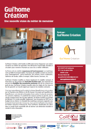 Gui’Home Création a été fondé en 2018, dans le but d’apporter une vision novatrice au métier de menuisier. Une démarche responsable, durable et circulaire pour remettre l’humain au cœur de ce métier millénaire.