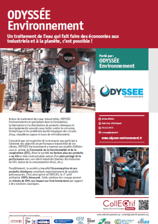 Conscient que son expertise de la ressource eau participe à l’atteinte des objectifs de performance industrielle de ses clients, ODYSSÉE Environnement a repensé son modèle d’affaire sous le prisme de l’économie de la fonctionnalité et de la coopération (EFC). Ainsi la société ne facture plus ses produits « au kilo » mais contractualise autour d’un plan partagé de la performance avec son client industriel (baisses des émissions de GES, baisse de la consommation d’eau, etc.).