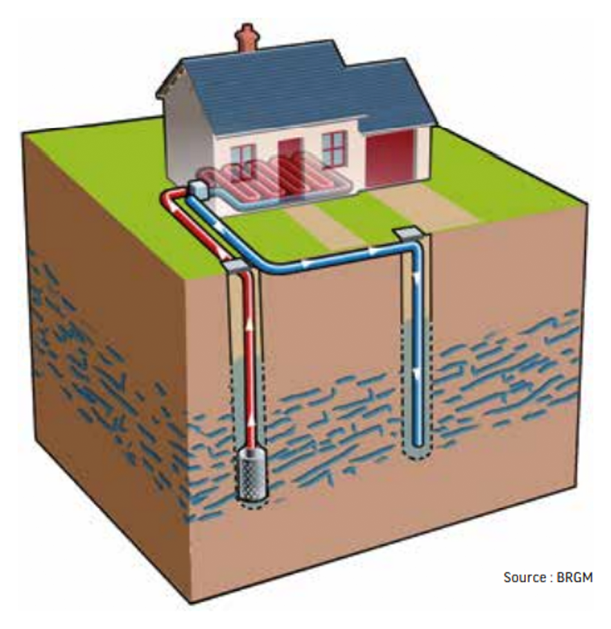 Elle consiste à pomper l’eau d’une nappe souterraine peu profonde par l’intermédiaire d’un ou de plusieurs forages pour l’acheminer (via un échangeur) jusqu’à la pompe à chaleur afin d’en prélever les calories, avant de la réinjecter dans l’aquifère d’origine par l’intermédiaire d’un second ou de plusieurs forages.