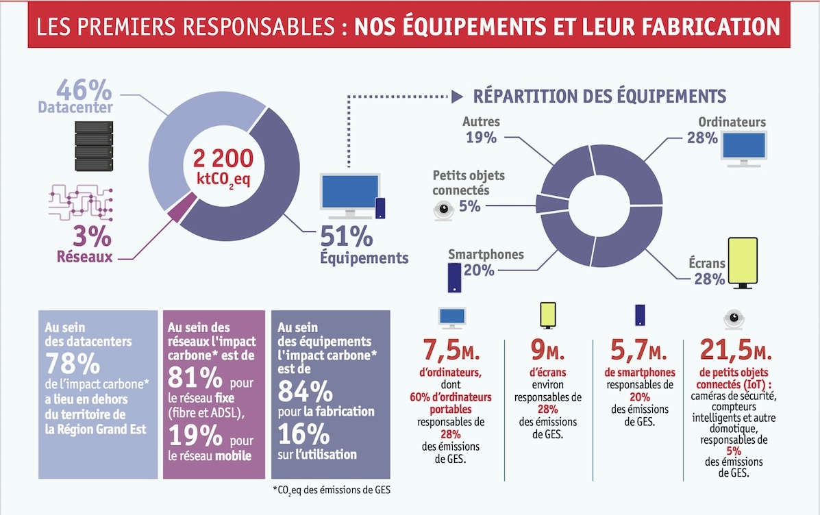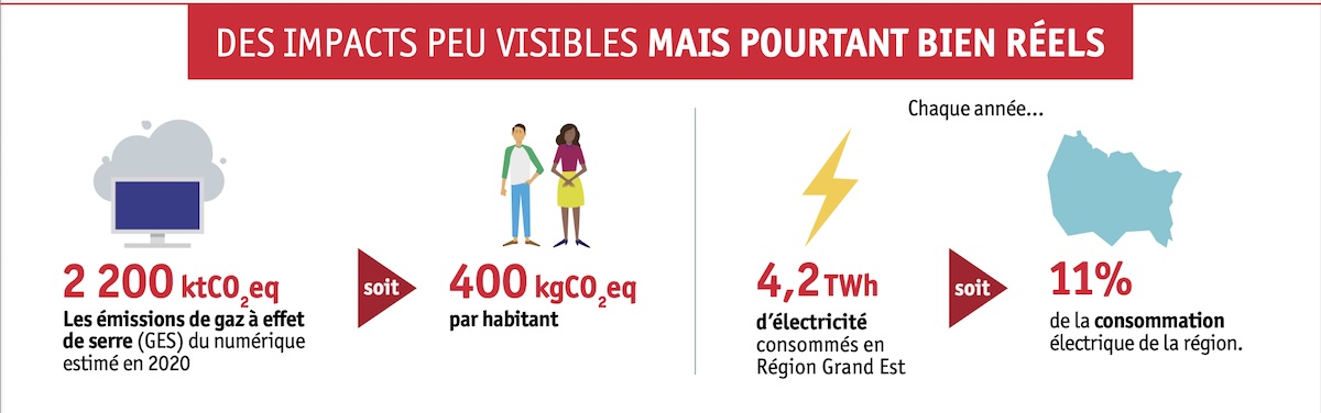 Une étude conduite par l’ADEME et la Région Grand Est précise l’impact environnemental des usages du numérique en Grand Est : les usages numériques ont généré en 2020 près de 2,2 millions de tonnes de CO₂eq, soit 5,5 % des émissions territoriales, ainsi que 11 % de la consommation électrique régionale. L’essor continu des usages et l’arrivée massive de l’intelligence artificielle laissent prévoir une hausse rapide de ces impacts, peu compatible avec les objectifs climatiques et la préservation des ressources. L’étude propose aussi des scenarii prospectifs à 2030 et l’étude de plusieurs cas d’usages. Pour consulter l’étude : https://www.climaxion.fr/docutheque/impact-environnemental-usages-du-numerique-grand-est